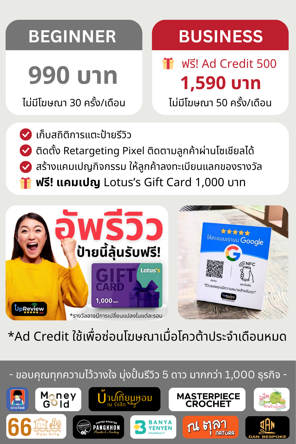 ป้ายแตะ UpReview สามารถช่วยให้ธุรกิจของคุณได้รับการมองเห็นมากขึ้นใน Google ยิ่งได้รับรีวิวมาก อันดับก็จะถูกดันขึ้นตาม